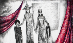Nadir gets to know another six kids like him, all with curly hair and black robes. Maybe they couldn’t think of black possibilities anymore. And with the lights shimmering over their heads, they guide to safety the ships that threaten to crash against the shores of The Wrong Side of Town. Ink on paper.